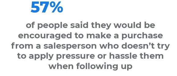 And don’t get aggressive. According to Invesp, 57% of people say they’d be more likely to make a purchase from a salesperson that avoids applying pressure.