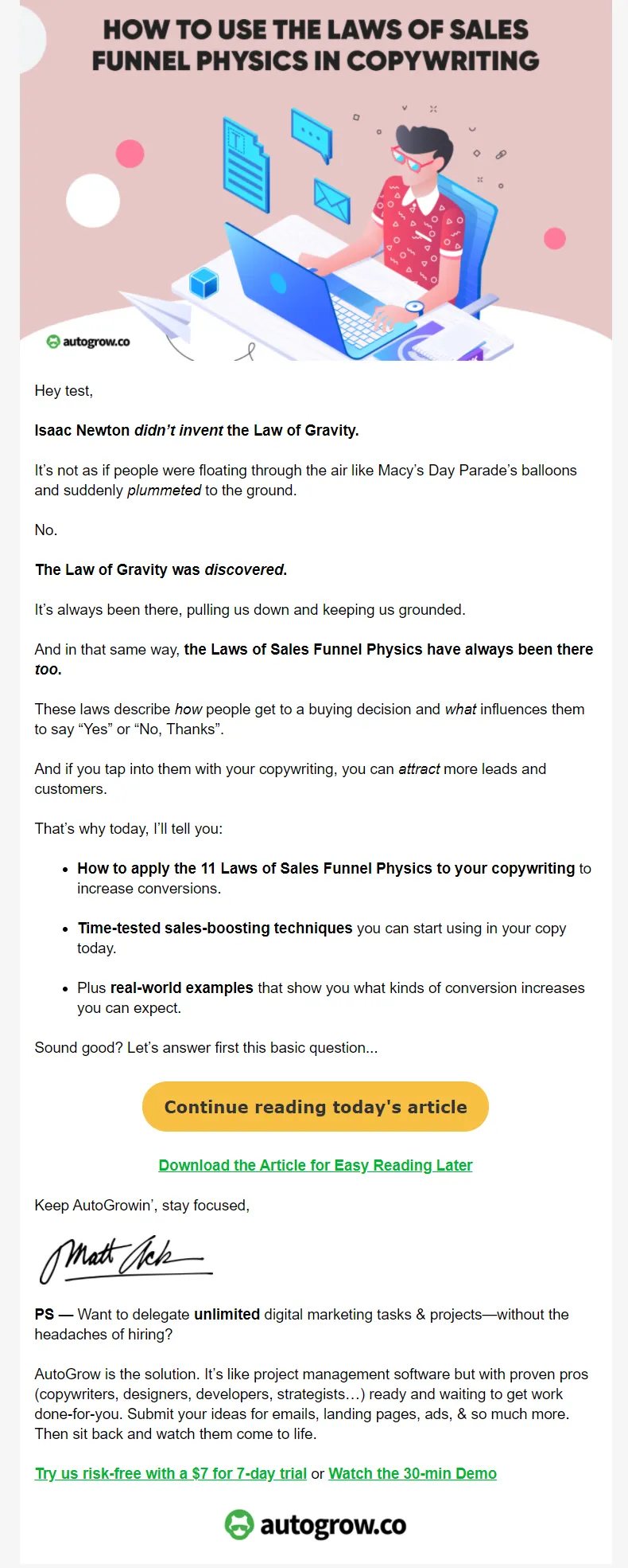 - A powerful, yellow CTA button with “Click here to read today’s article”