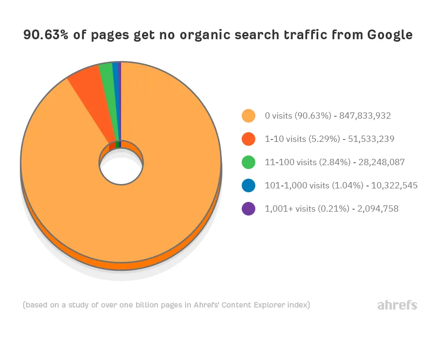 Ahrefs, an SEO-obsessed company that offers, you guessed it, SEO tools, did a little analysis on over one billion pages. Surprisingly, they found that only 9.37% of them get any Google traffic. And just 1.25% of pages receive more than 100 visits per month. Pretty pathetic, huh?